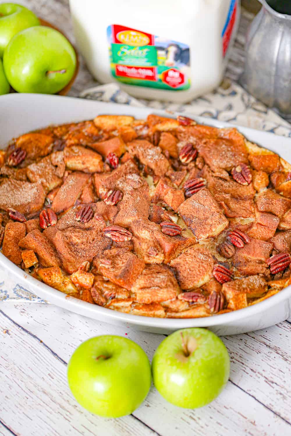- You can let the bread soak anywhere from a few minutes while you are waiting for the oven to pre-heat to overnight in the fridge for the next day. If you do the latter, wait to add mix in the apples and add the cinnamon sugar mixture on top, right before you bake the bread pudding.