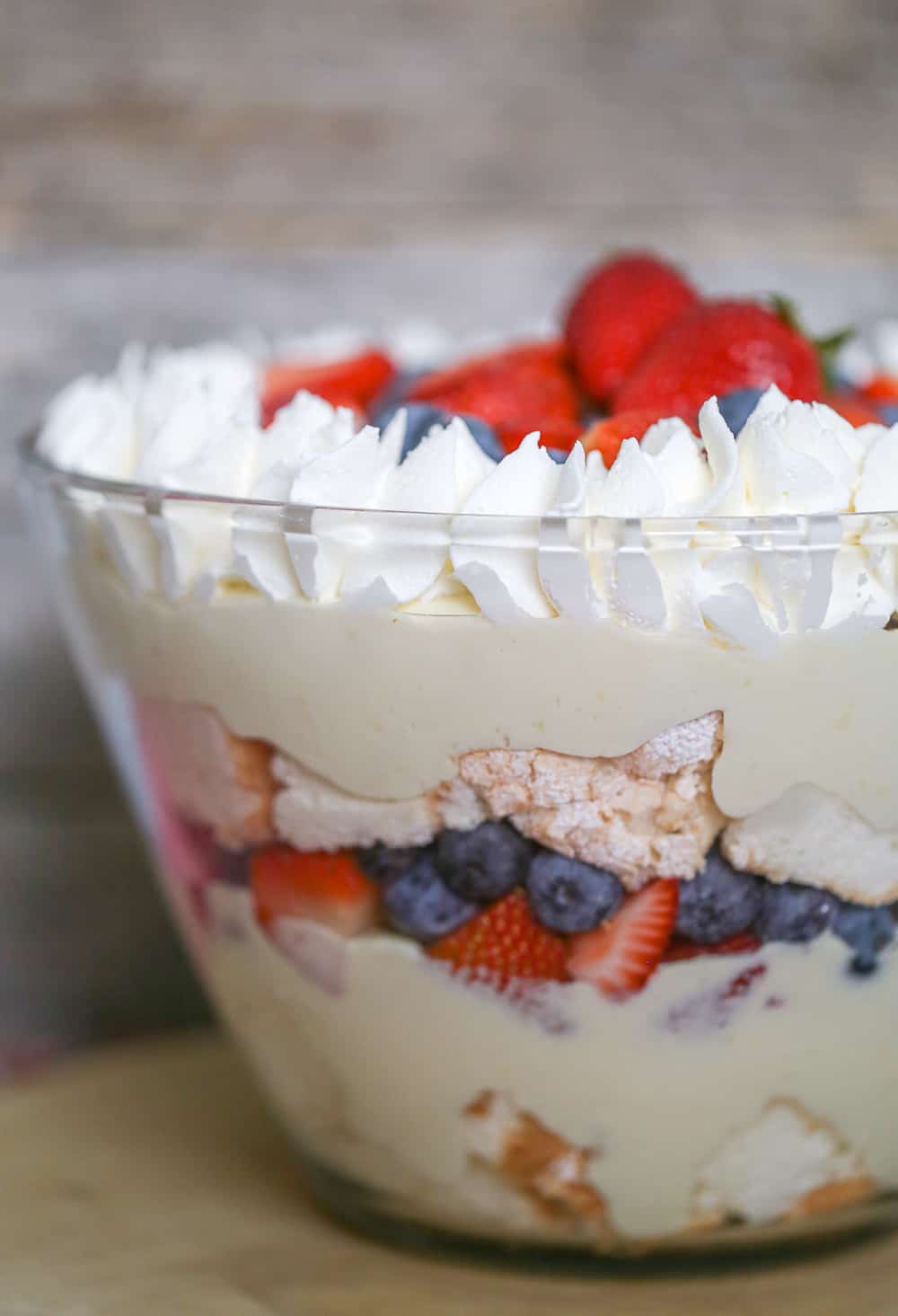 We really love this berry dessert for all the patriotic holidays for sure, with the red, white and blue! We can’t miss when we are serving up this berry trifle with angel food cake! Who else wants to dig in our lush berry trifle with angel food cake? Goooo USA!