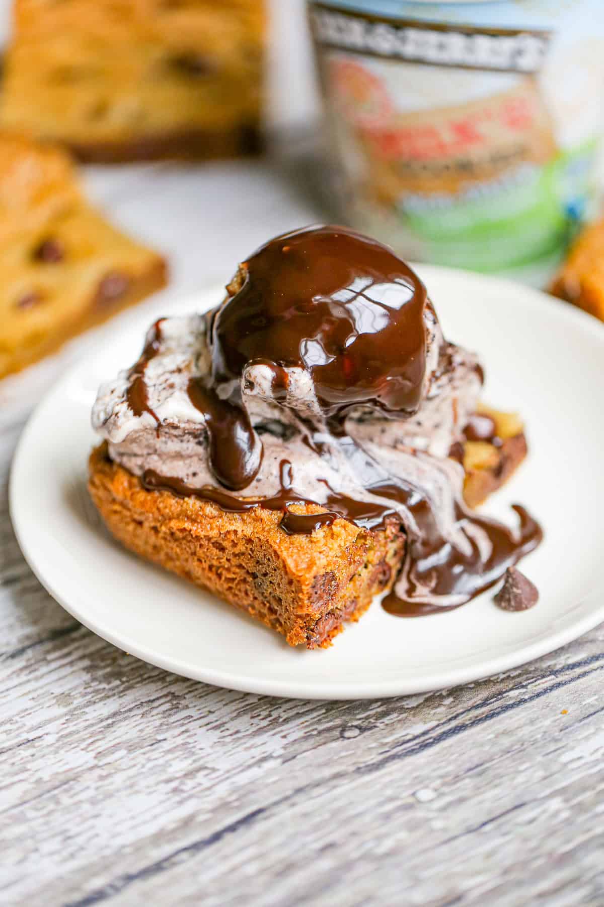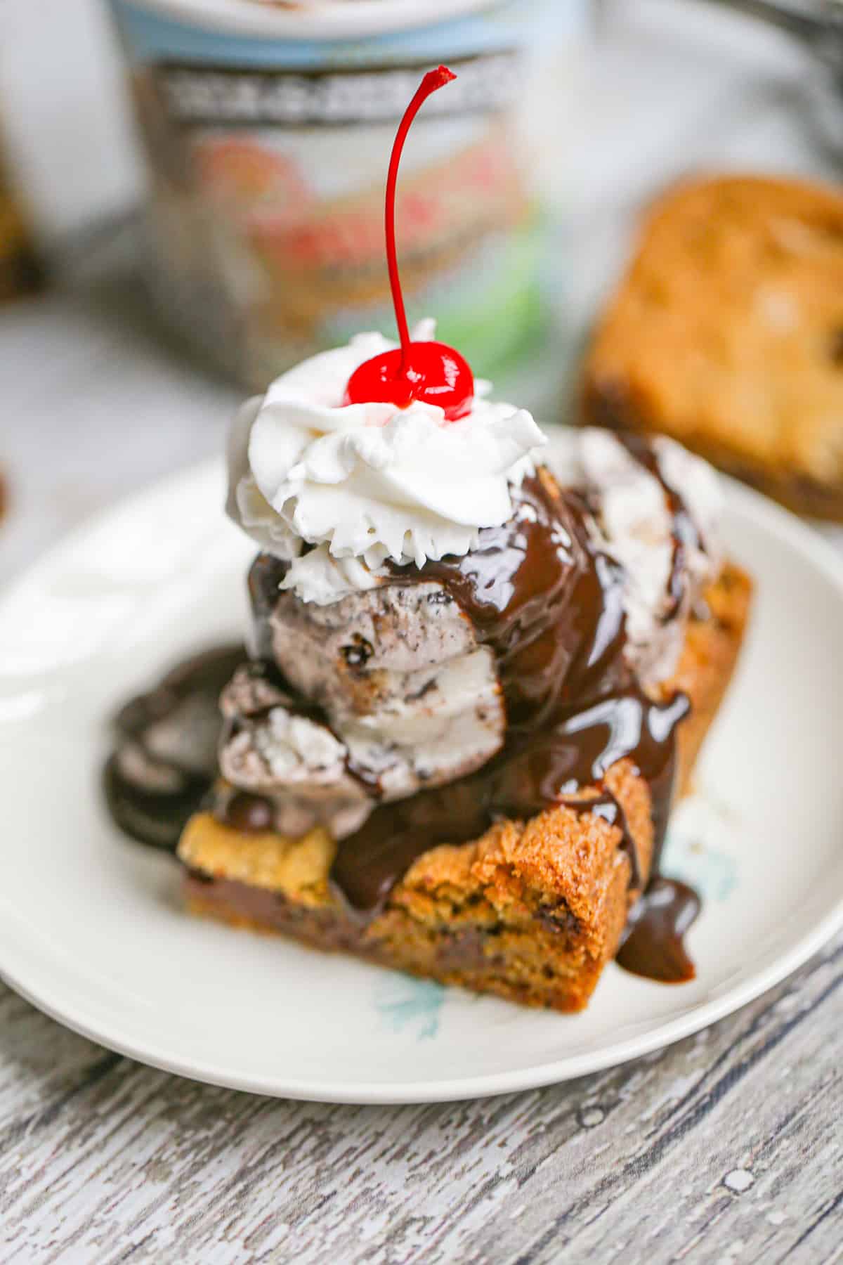 - Or, elevate it to the next level by serving a yummy slice of warmed up cookie bar with a huge scoop of vanilla ice cream, hot fudge, whipped cream and cherry on top! So delectable!