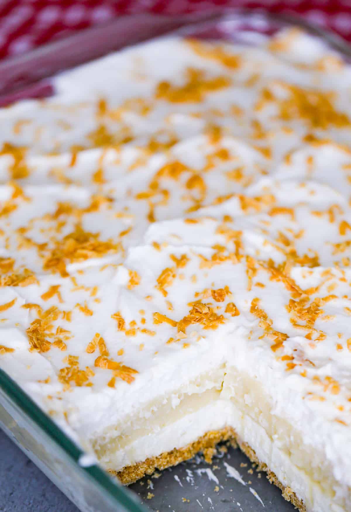 - Spread whipped cream on top, sprinkle toasted coconut, and add optional caramel, chocolate sauce, or chips. Chill for several hours before serving.