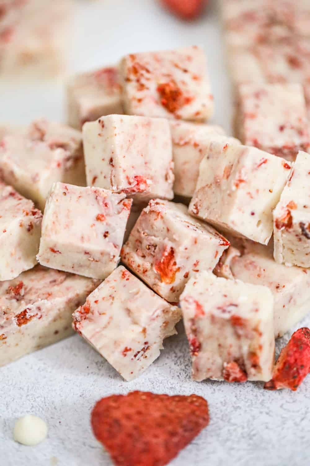 We made this strawberry fudge recipe easy for you! Rather than combining sugar, butter, and cream, we are using sweetened condensed milk which replaces all these ingredients, so it’s pretty straight forward when you are making it in the microwave or the stovetop. By adding coarsely crushed up freeze-dried strawberries to the white chocolate fudge, you get intense strawberry flavor!