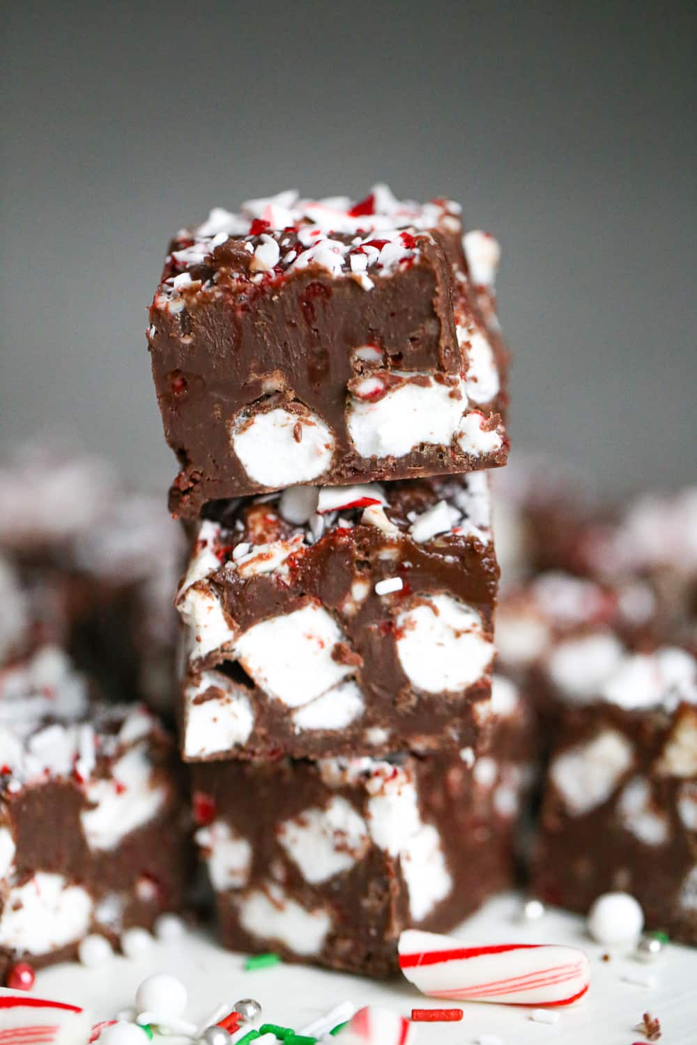 Whip up some of this decadent Peppermint Marshmallow Fudge for the holidays! This 5 minute, super-easy chocolate fudge is so creamy delish with mini marshmallows and crushed peppermint crunch all throughout!
