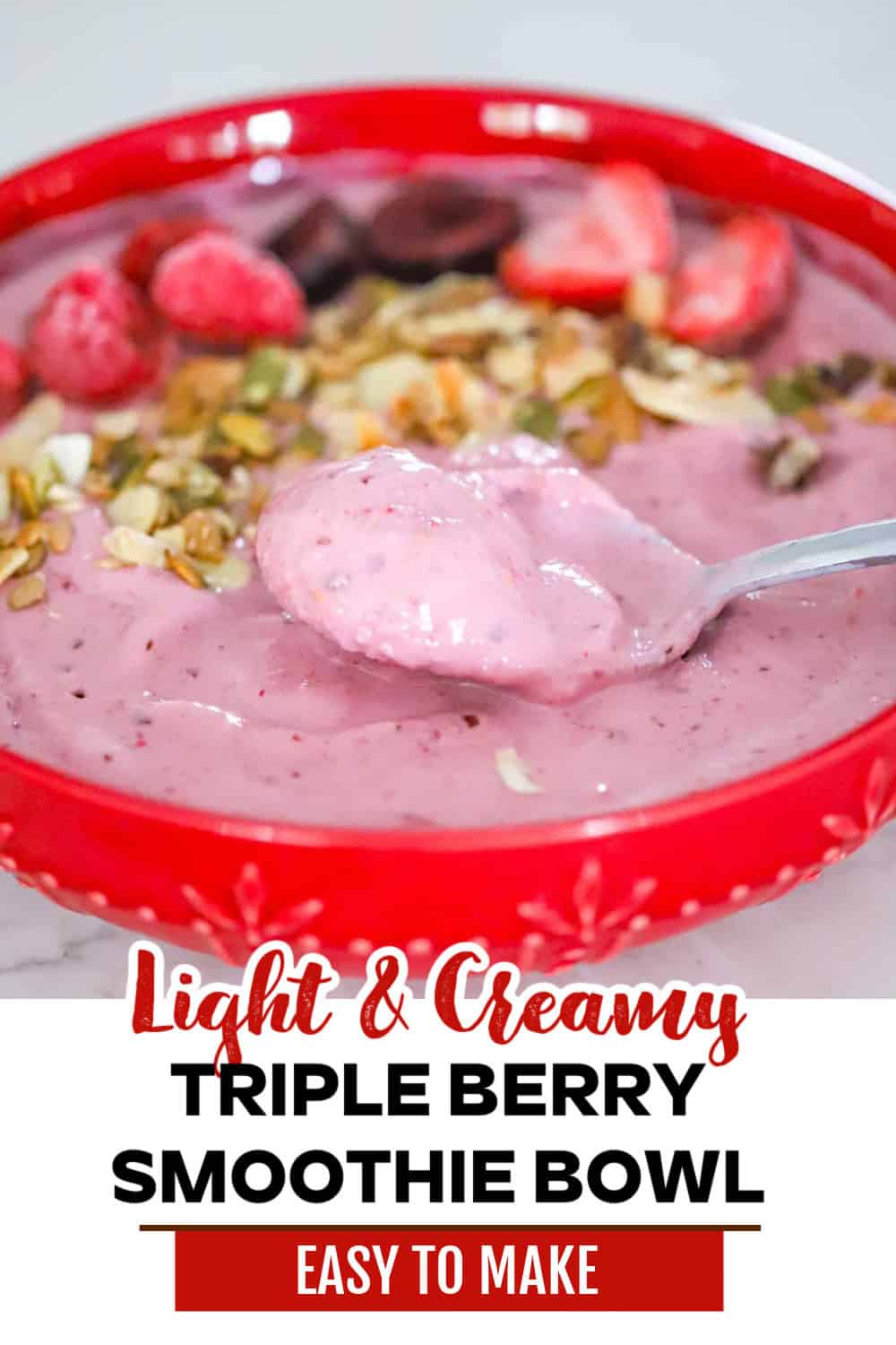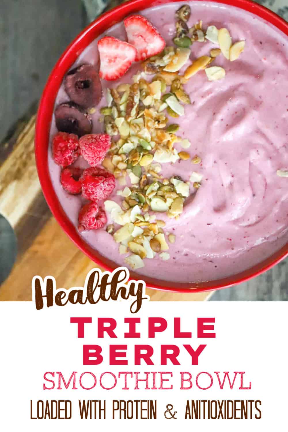 Start your morning with this healthy triple berry smoothie bowl. Made with a blend of strawberries, raspberries, and cherries, plus creamy Greek yogurt, it’s a nutritious way to power your day. Enjoy a filling breakfast that’s both delicious , flavorful and colorful.